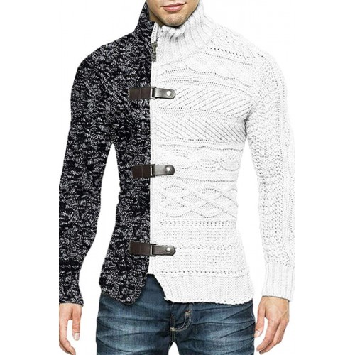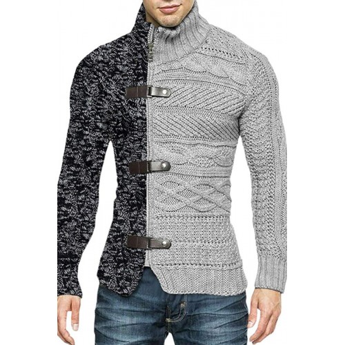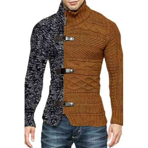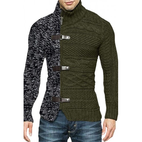 Men's Color Matching Leather Button Long-sleeved Knitted Cardigan